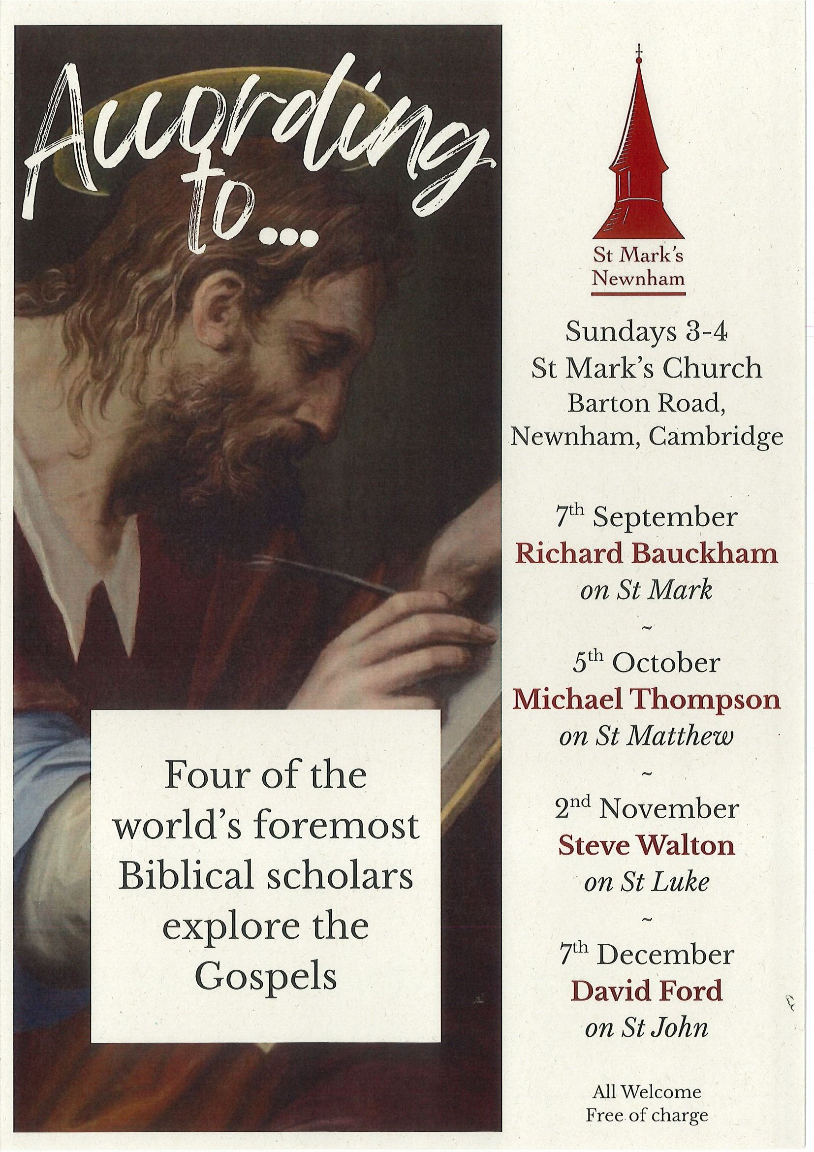 A series of four talks at 3-4pm on Sundays, beginning on 7th September and continuing thereafter on the first Sunday of the month. Talks will be delivered by four of the world’s foremost Bible scholars and will cover each of the Gospels in turn. All are welcome – particularly people from other churches, and of no church at all! – and admission is free. No need to book, just turn up!